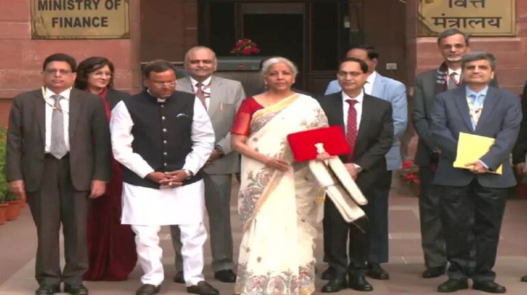 The finance minister's white saree with a colourful Madhubani motif and intricate golden border was paired with a red blouse and a shawl. Her accessories included gold bangles, a chain, and earrings.