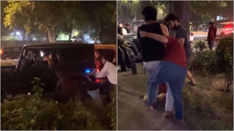 In the next part, the same woman who was earlier restrained is seen standing near a Thar SUV, shouting angrily at the man in the black vest. The argument intensifies as he pushes her, causing her to fall. Her brother attempts to stop her from reacting further, but she continues shouting, saying, “Tune meri behen ko hath kaise lagaya? (How dare you touch my sister?)."