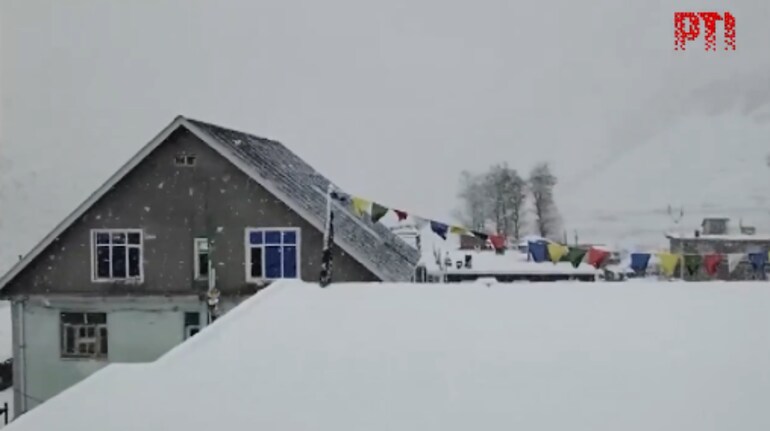 VIDEO | Lahaul-Spiti: Cloudy skies and fresh snowfall over high peaks bring a chill to Manali and surrounding valleys.(Full video available on PTI Videos – https://t.co/n147TvrpG7) pic.twitter.com/XN69fjntSy