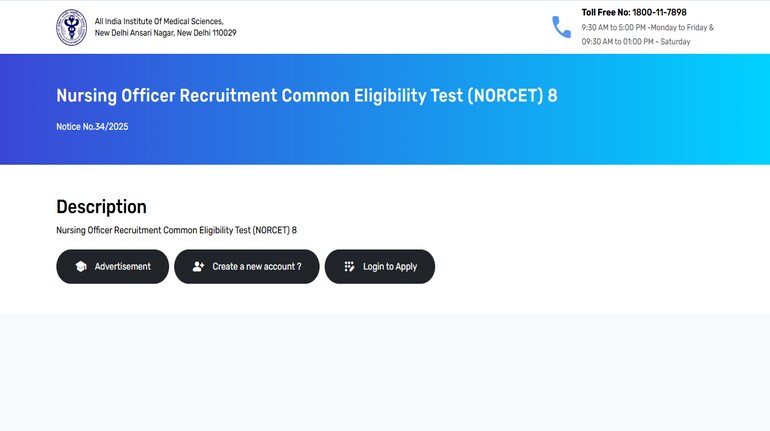 The All India Institute of Medical Sciences (AIIMS), New Delhi, has started the online registration process for the AIIMS Nursing Officer Recruitment Common Eligibility Test (NORCET) 8, 2025. Interested and eligible candidates can visit the official website, aiimsexams.ac.in, to apply. The last date to submit applications is March 17, 2025. Further details, including the exam date and admit card release, will be announced soon.