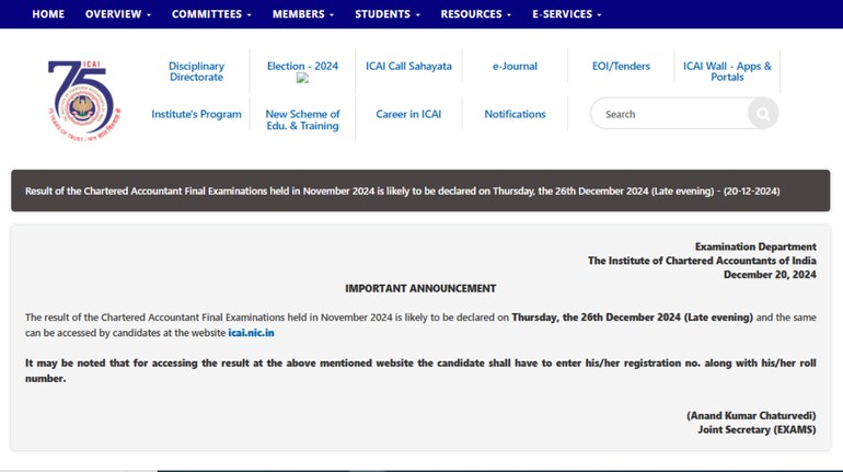 The ICAI’s notice stated, “The result of the Chartered Accountant Final Examinations held in November 2024 is likely to be declared on Thursday, the 26th December 2024 (Late evening) and the same can be accessed by candidates at the website icai.nic.in.”