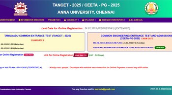Anna University has extended the registration deadline for TANCET 2025 and CEETA-PG 2025 to February 26, 2025. The Tamil Nadu Common Entrance Test (TANCET) is conducted for admission to MBA and MCA courses, while the Common Engineering Entrance Test & Admissions (CEETA-PG) is held for ME, MTech, MArch, and MPlanning courses. This extension gives applicants more time to complete their registrations.