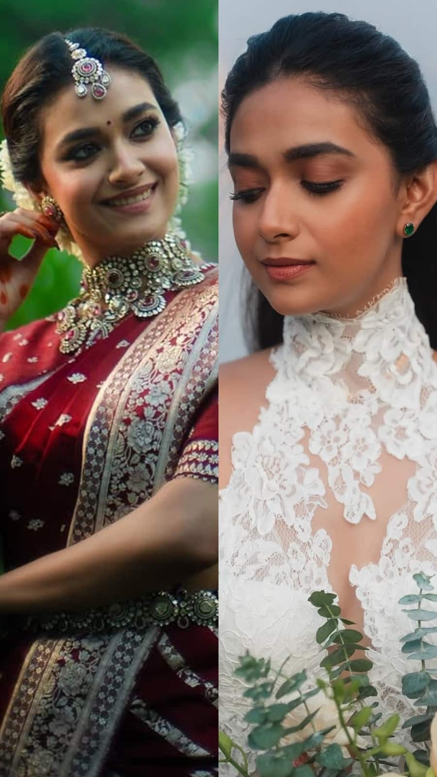 For her white wedding, Keerthy embraced classic elegance in a lace-detailed halter-neck gown, paired with a breathtaking long veil trail.