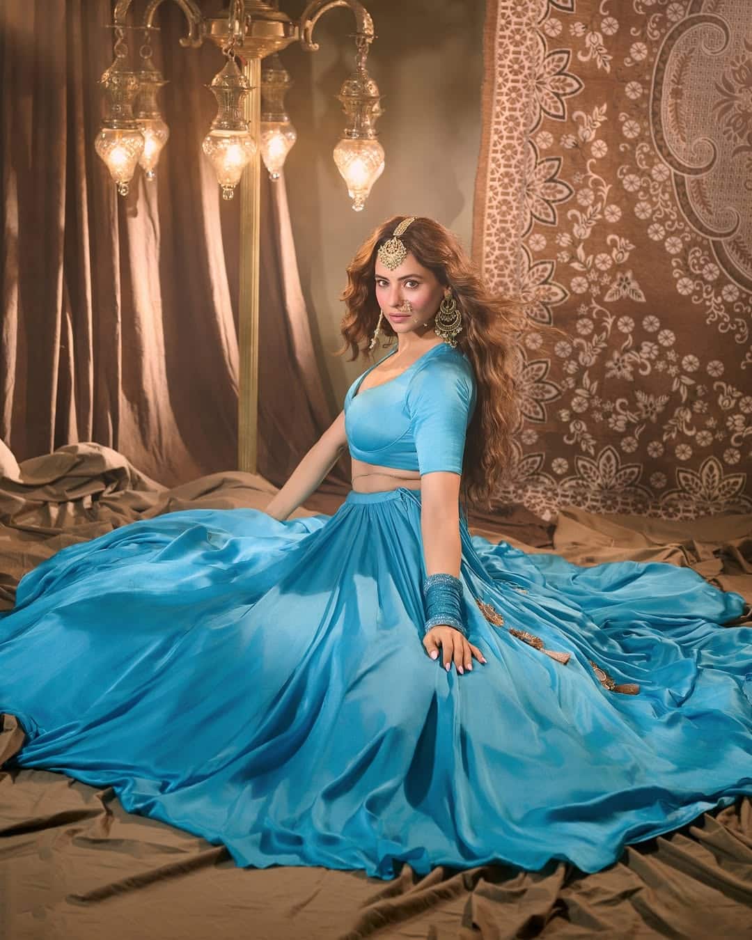 Her voluminous, cascading curls add drama and softness, perfectly complementing the traditional ensemble.