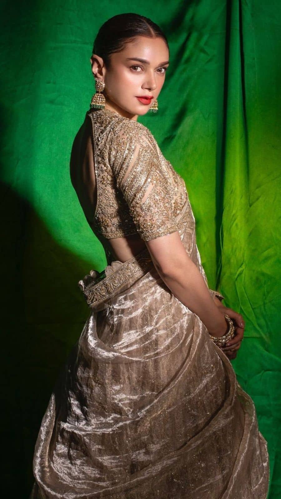 Aditi Rao Hydari’s sheer blouse with voluminous balloon sleeves and a deep-plunge neckline adds a touch of modern drama to traditional saree attire. Perfect for Diwali, this blouse style is for those who love a chic, contemporary twist on festive wear.