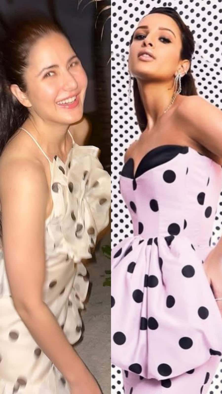 Katrina Kaif captivates in a black and white polka dot halter-neck dress, accented with delicate flower patterns. The blend of classic and feminine details makes this outfit truly unforgettable.
