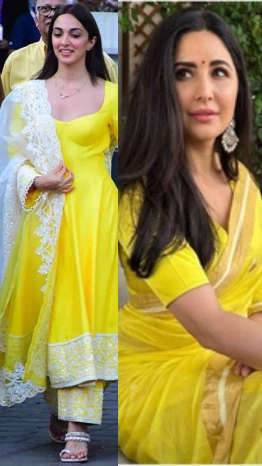 Katrina Kaif stuns in a radiant yellow saree with golden borders and matching blouse, accessorised with two classic kadhe.