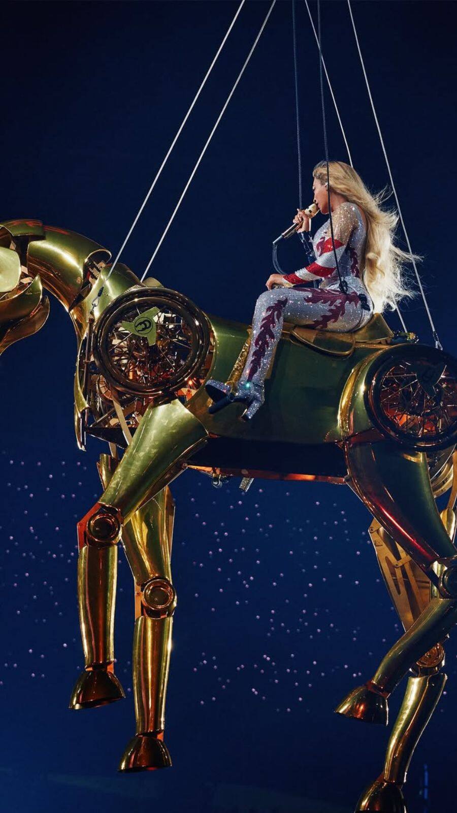 Beyonce’s studded leather and bold buckles with fierce attitude. She channels outlaw energy in this star-spangled statement.