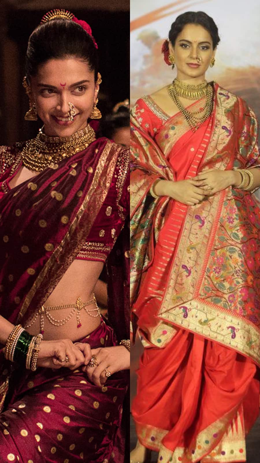 Kangana Ranaut sported rich Nauvari sarees in Manikarnika: The Queen of Jhansi, embodying the fierce and regal persona of the Jhansi queen. She carried the look with power and grace.