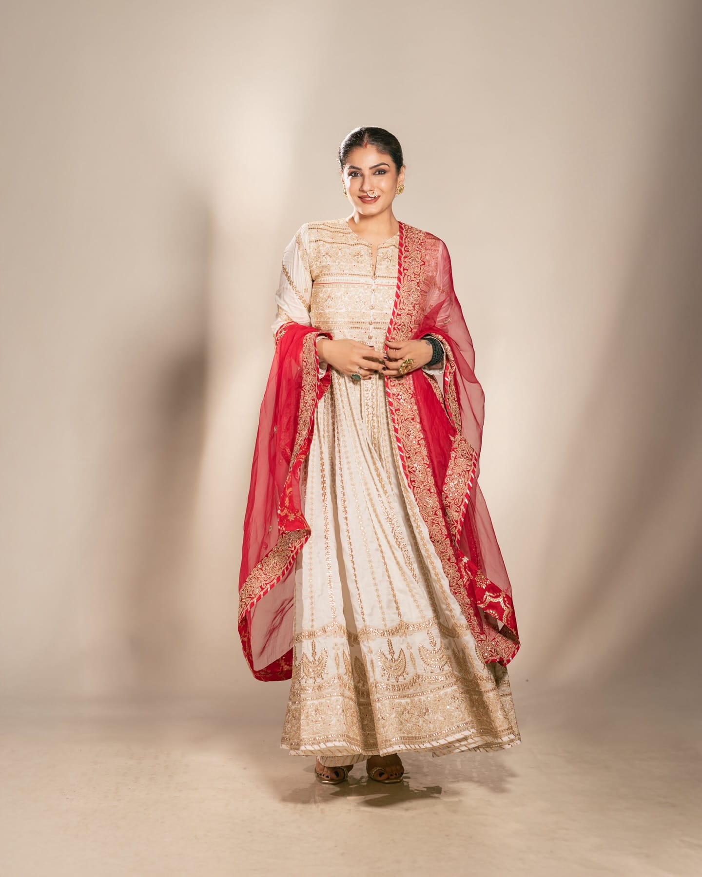 Actress Raveena Tandon looks ravishing in a white and red salwar suit with hair tied in a bun as she reached Sunita Kapoor’s residence.
