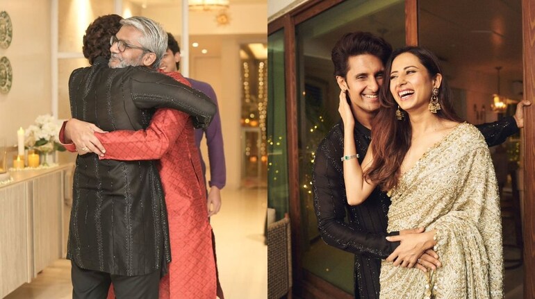 Sargun Mehta was seen sharing a cheerful moment with Arjun Bijlani and his wife during the Diwali celebration. Dressed in a gorgeous golden outfit, Sargun radiated festive elegance, while Arjun looked dashing in an intricately embroidered kurta. His wife complemented the duo perfectly in a stunning black ethnic ensemble. Their bright smiles and warm camaraderie captured the true spirit of the festivities — joy, friendship, and togetherness.