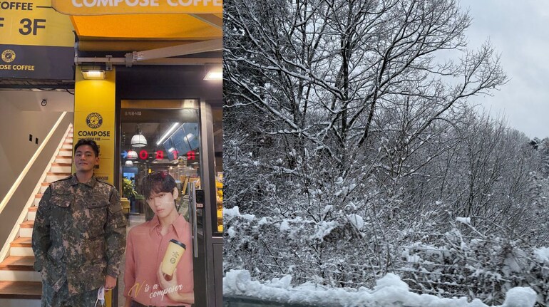 BTS’ V took to Weverse to connect with ARMYs, sharing a photo of himself in his military uniform. In the image, he is seen leaning against a coffee shop window, with his poster displayed on it.