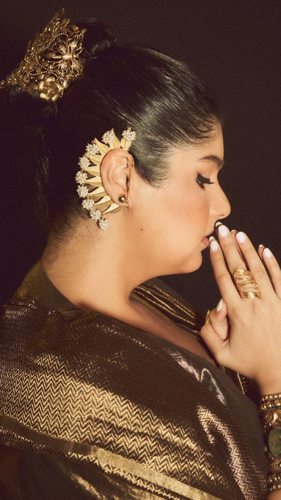 Anshula Kapoor paired her brown saree with a black belt and an eye-catching ear cuff, featuring floral petal designs, elevating the quirk factor of her outfit.