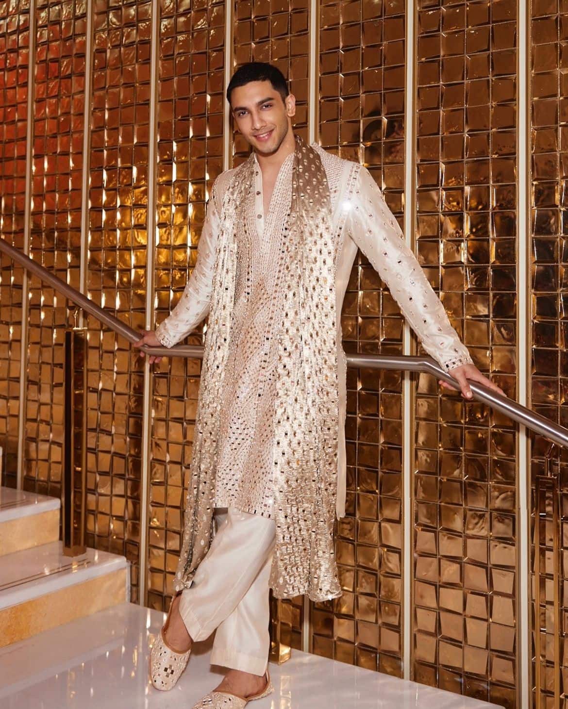 Aditya commanded every attention with his navy blue kurta adorned with intricate white thread embroidery on one shoulder and the diagonal hemline.