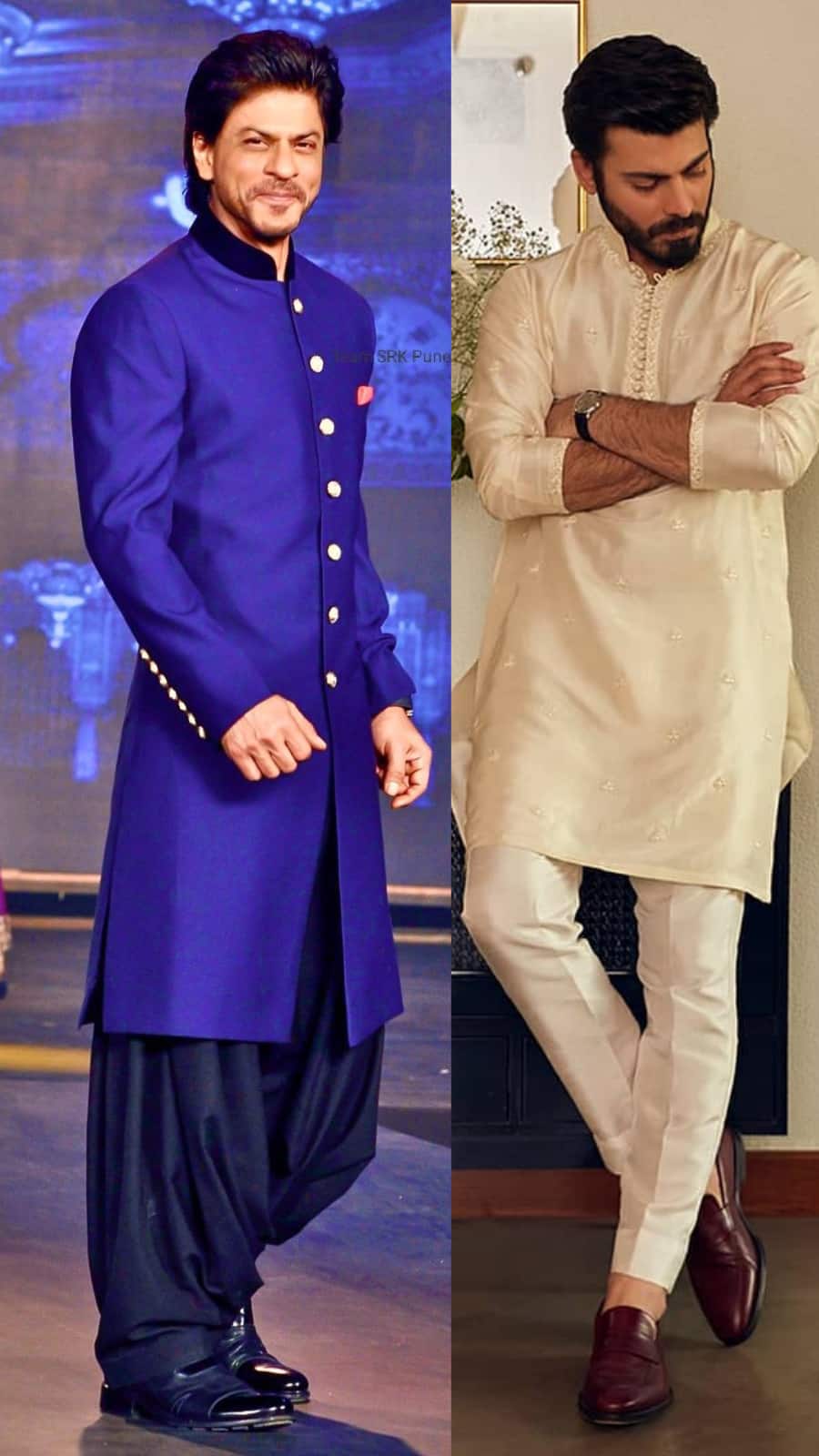 Fawad Khan showcases a regal black sherwani adorned with intricate gold embroidery, offering a timeless and sophisticated look.