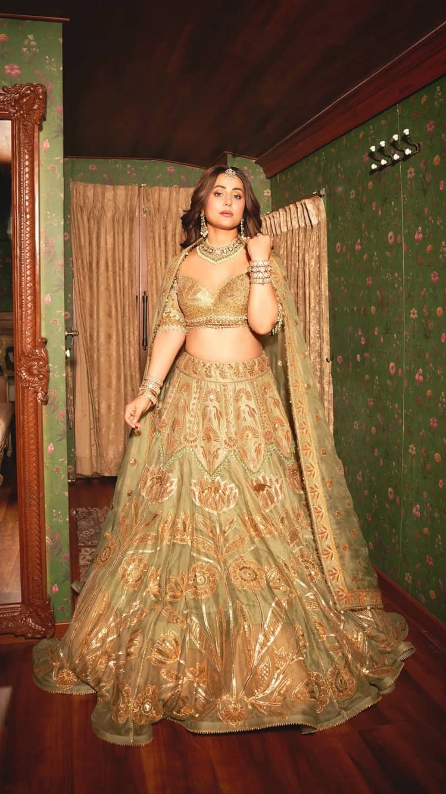 Hina Khan stuns in a dazzling golden lehenga, exuding grace with intricate embroidery and shimmering detailing.
