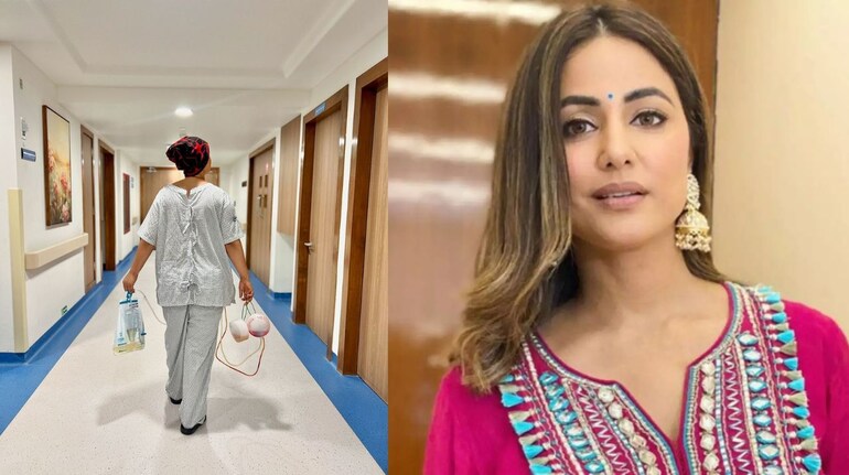 Hina Khan recently took to Instagram to share a photo of herself walking through the corridors of the hospital. In the image, she is dressed in hospital attire, with an IV drip attached to her arm and two boxes that appear to contain blood. The post reflects her ongoing fight against breast cancer, showcasing her strength and determination during this challenging time.