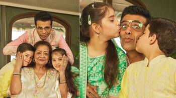 Karan Johar is seen dressed in a pink kurta with white threadwork, paired with beige pants. Yash mirrors his father's style in a yellow kurta featuring the same white threadwork, also wearing beige pants. Roohi looks adorable in a green lehenga, complemented by a bunch of matching bangles on both wrists.
