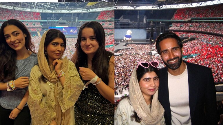 Nobel laureate Malala Yousafzai recently attended Taylor Swift’s concert at Wembley Stadium in London, accompanied by her husband, Asser Malik. She shared a series of vibrant photos from the electrifying evening on Instagram. The photos begin with Malala and Asser beaming at the camera, followed by a nostalgic throwback picture of Malala with her childhood friend Moniba. The sequence continues with Malala making a heart gesture, reveling in the concert with her loved ones.