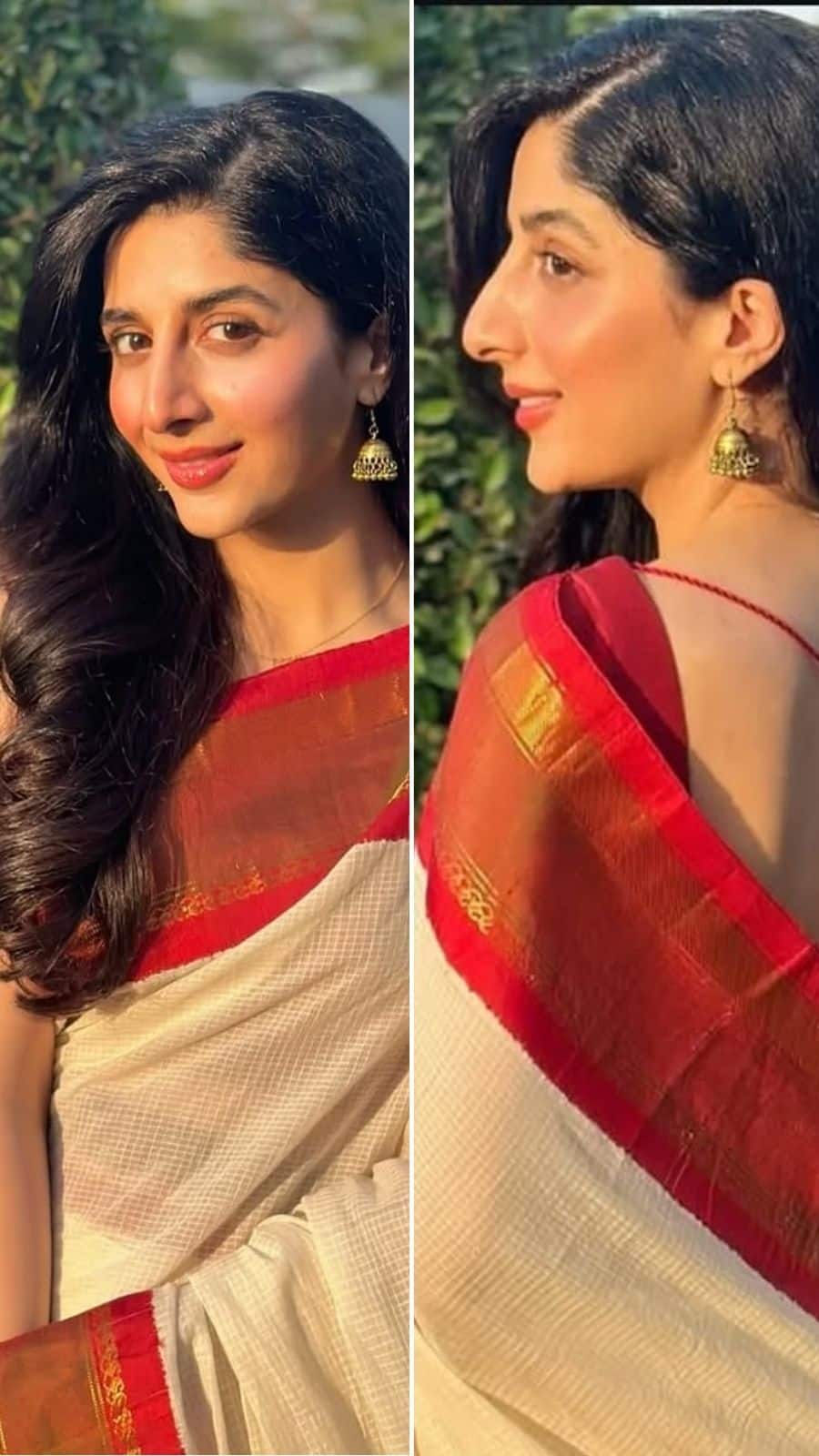 Mawra donned this beautiful off-white saree with red border for this year’s Eid party.
