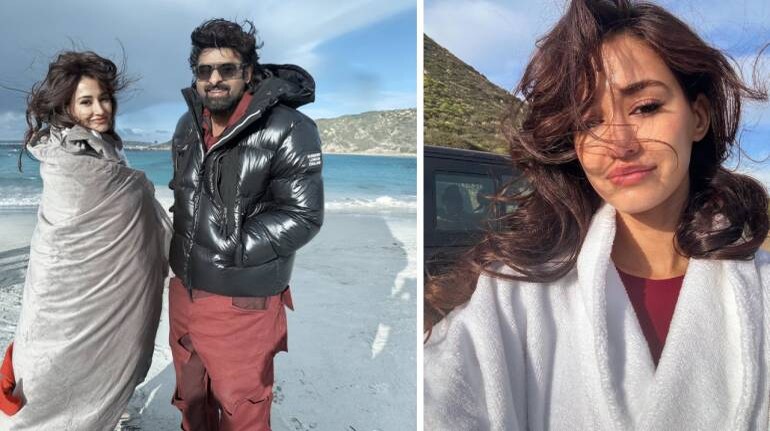 Disha Patani shared many pictures from the song's location, which was very windy and cold. Disha was seen wrapped in a huge quilt-like cloth while her team followed her back to the vanity from the beach side.