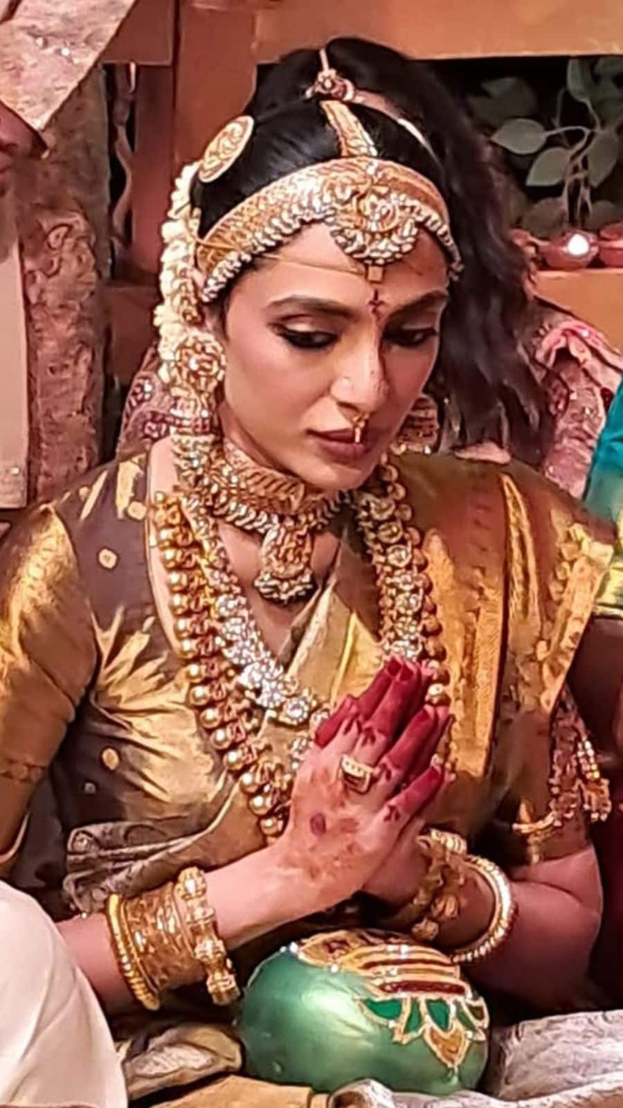 Sobhita is seen all attentive at her wedding ceremony. Also seen here with her mother at the ceremony. Sobhita chose to wear heavy temple jewellery.