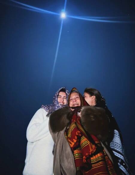 In the cold desert, Navya and Shweta embrace the veteran actor, Jaya Bachchan, from both sides.