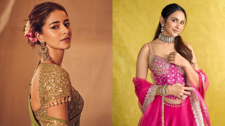 Rakulpreet Singh Rakulpreet Singh looks radiant in a vibrant pink traditional outfit for Ganpati celebrations. She is wearing a beautifully embroidered lehenga choli with intricate golden zari work on the blouse and the hem of the skirt. The sheer pink dupatta with golden borders adds elegance to the ensemble. Her look is complemented by statement jewelry, including a choker necklace, jhumkas, and rings. Rakulpreet’s minimal makeup and loose hair enhance her graceful and festive appearance perfectly.
