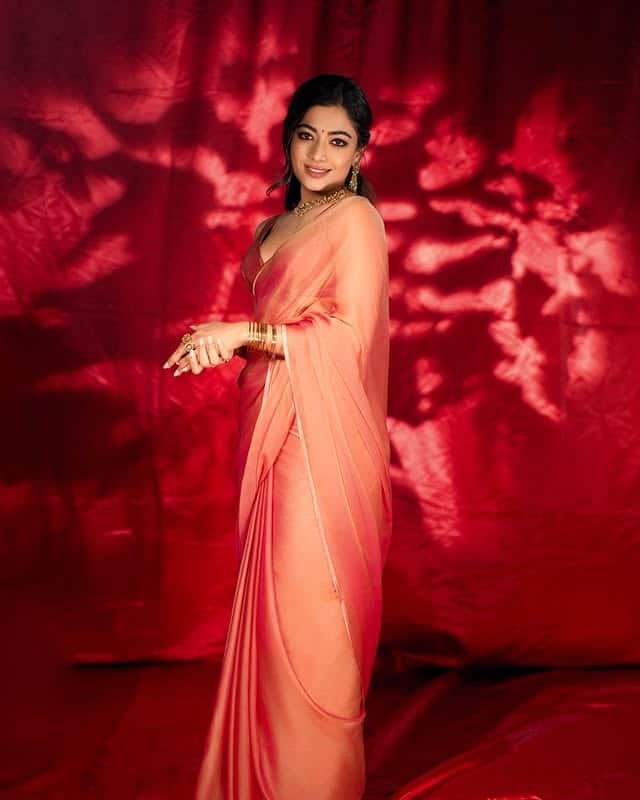 Rashmika dazzled in a dusty rose saree with floral prints, strappy blouse, and minimal makeup—graceful, elegant, and timelessly beautiful.