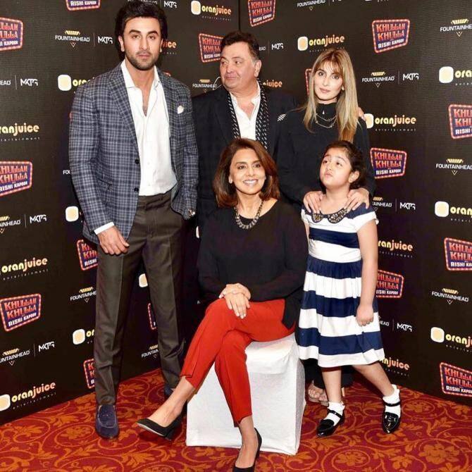 In this heartwarming family portrait, Rishi Kapoor beams with joy as he poses alongside Neetu, Ranbir, Riddhima, and little Samara.