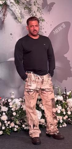 Salman Khan kept it effortlessly stylish at Arpita Khan’s birthday bash, donning a plain black tee paired with funky, desert-printed trousers. He completed the look with rugged brown shoes, exuding his trademark cool and casual vibe.