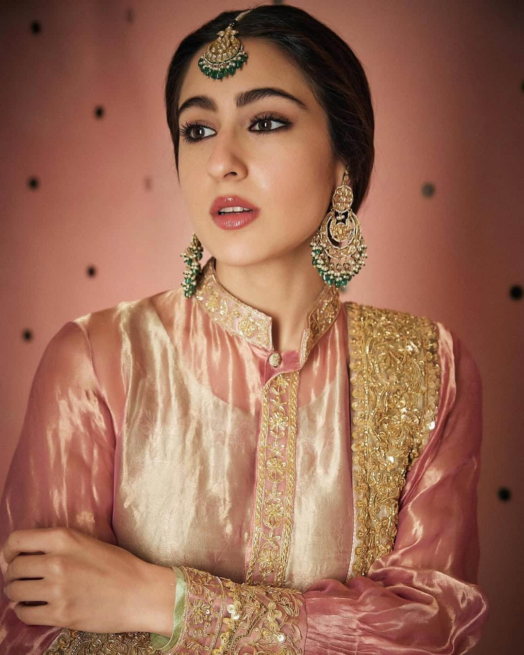 Sara often adds a statement dupatta to her look, whether it’s a lightweight chiffon style or a heavier embroidered version, to complete her festive outfit.