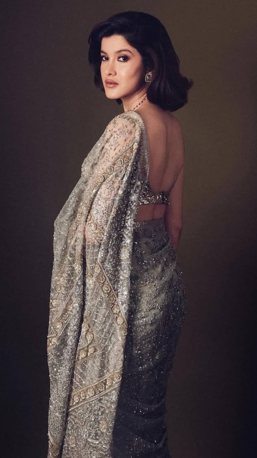 Bringing retro glam back, Shanaya dons a shimmery saree with a strappy blouse that adds modern edge to tradition.