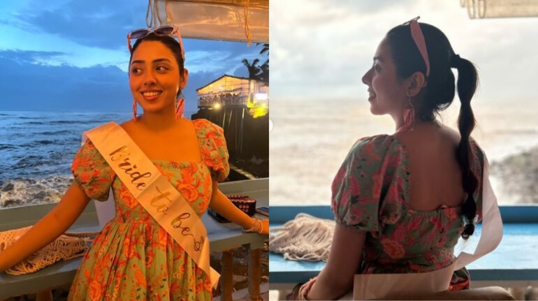 The bride-to-be looked radiant in a floral dress, accessorized with a 'Bride-To-Be' shoulder strap, hand bracelets, and pink earrings. She completed her look with a subtle makeup look, a few rings, and styled her hair in a charming 'Jasmine' style.