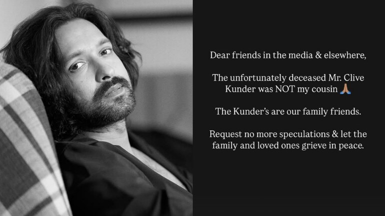 The actor took to his Instagram Story and wrote, “Dear friends in the media and elsewhere, the unfortunately diseased Mr. Clive Kunder was not my cousin. The Kunders are our family friends. Request no more speculations and let the family and loved ones grieve in peace.”