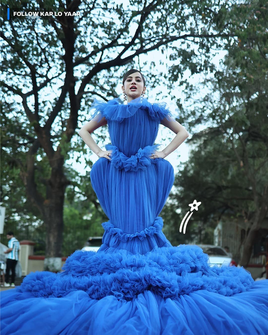 Uorfi’s deep neckline tube blouse adds oomph to her sensuality.