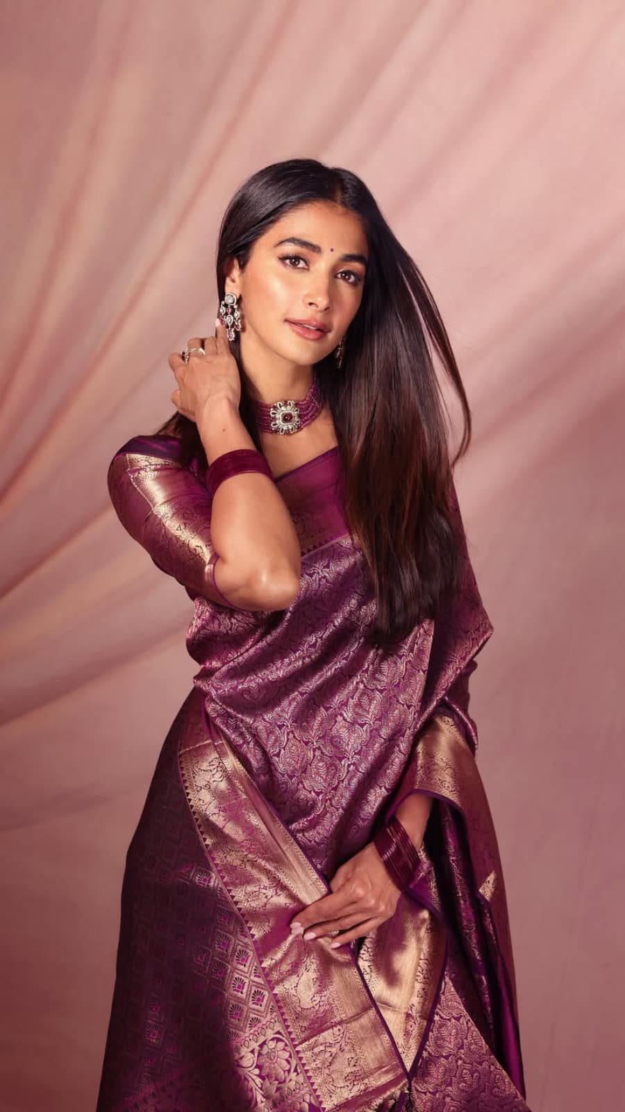 Her beauty is unmistakable in this rich purple-toned Kanjeevaram saree