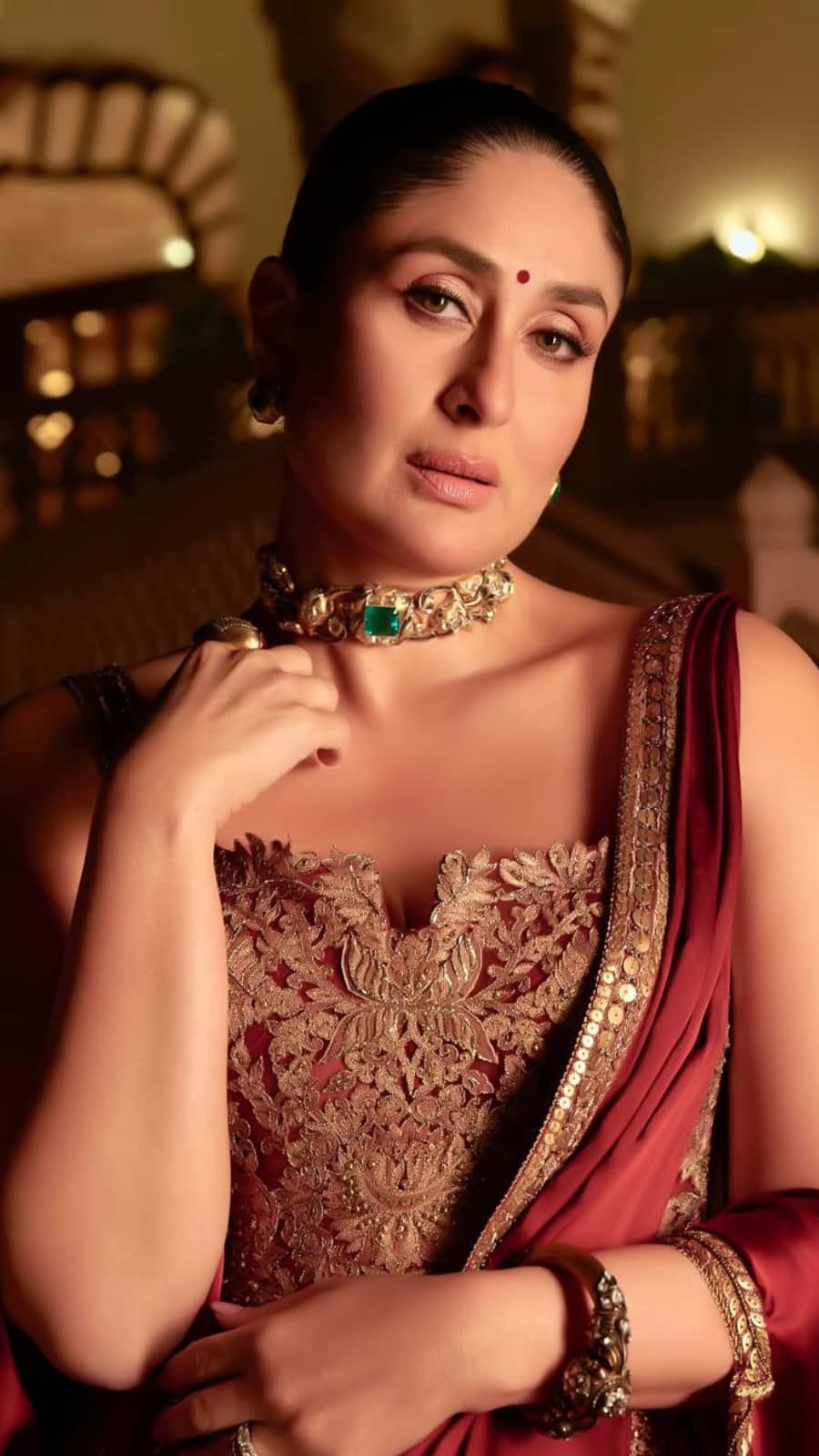 Kareena slayed in a beautiful gold choker featuring an emerald at the center, perfectly complementing her red outfit