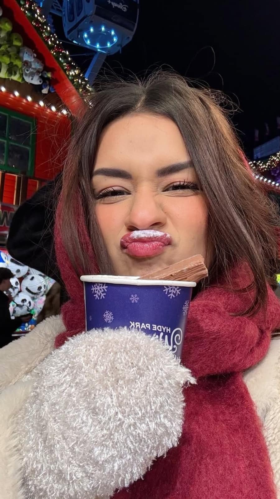 The Gen Z star kept it snug in a beige fleece jacket paired with a contrasting red stole