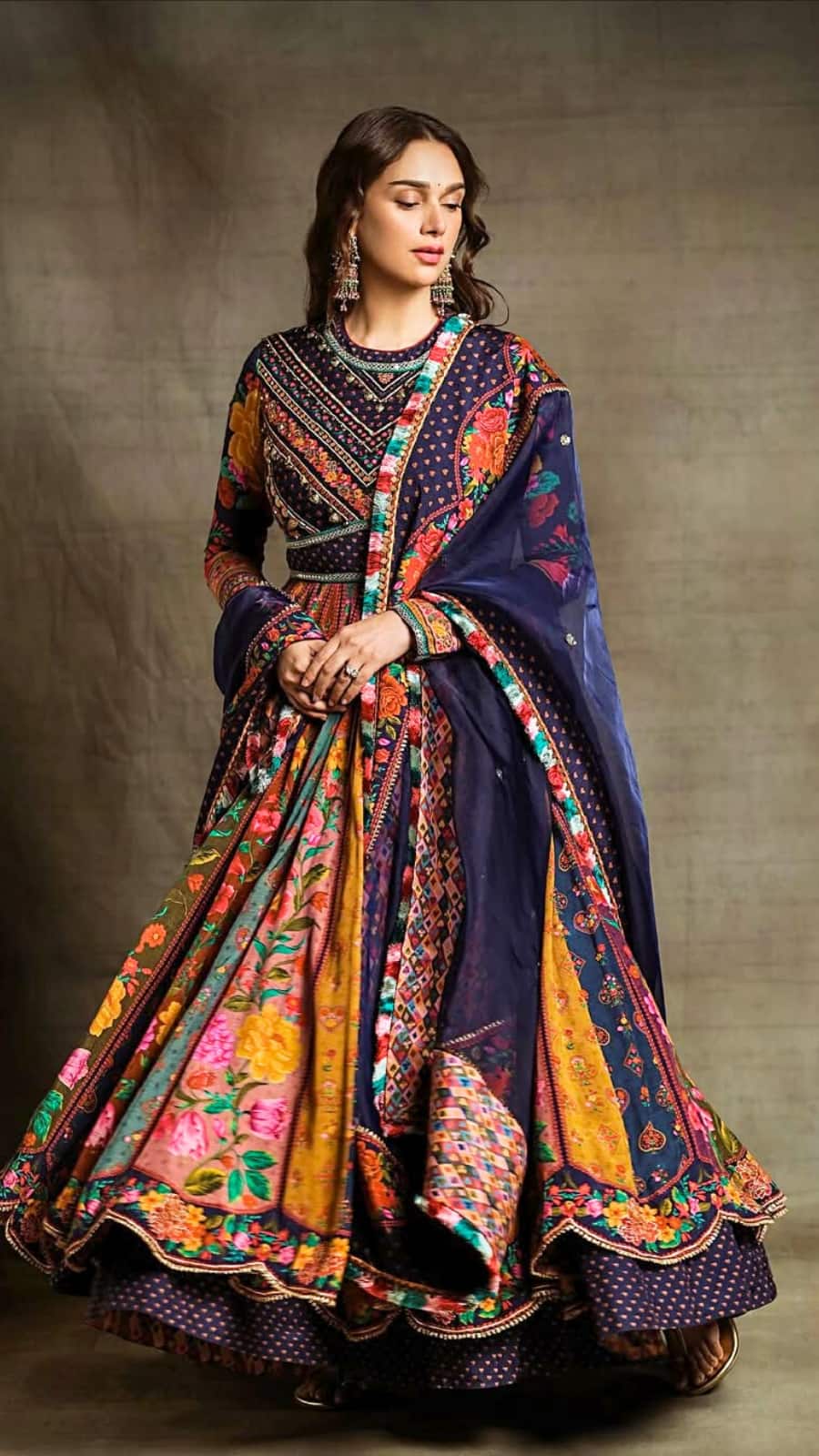 It’s hard to take your eyes off Aditi’s stunning Anarkali, featuring slub silk panels and floral motifs