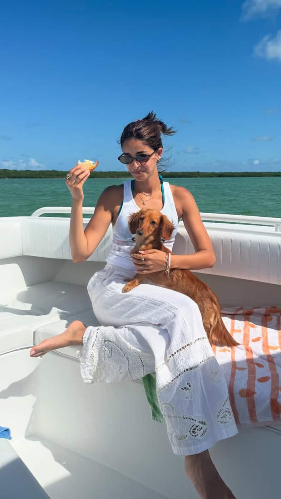 The actress’ boat ride look was all about a summery yellow top, distressed denim shorts, and sunnies