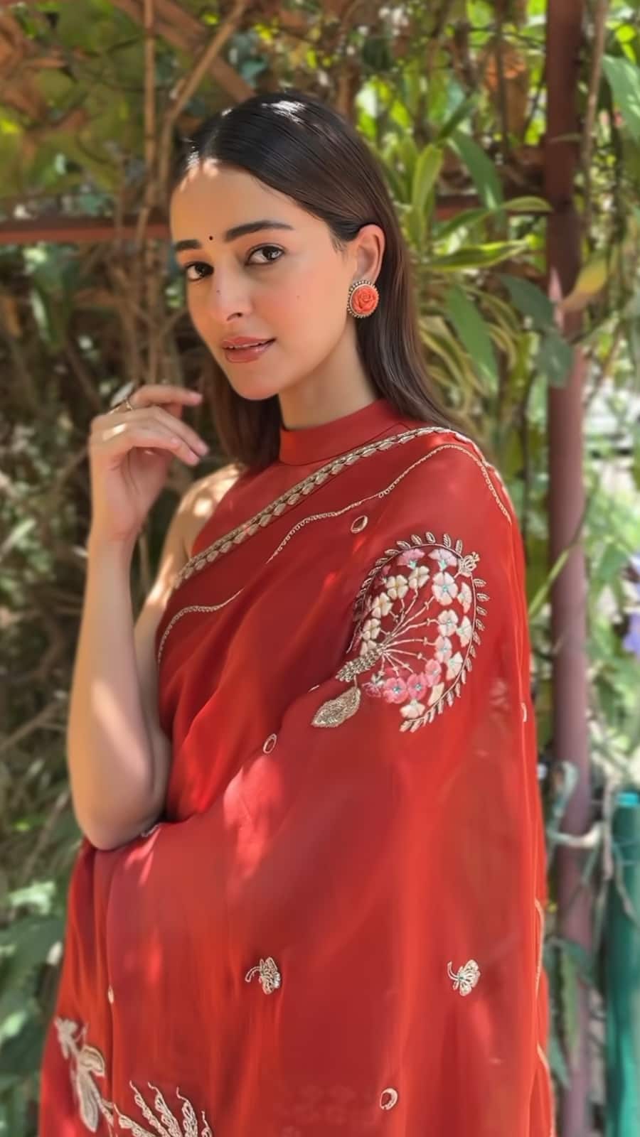 Ananya, who loves dolling up in sarees for events, wore a gorgeous rust-hued number for Kesari Chapter 2 promotions
