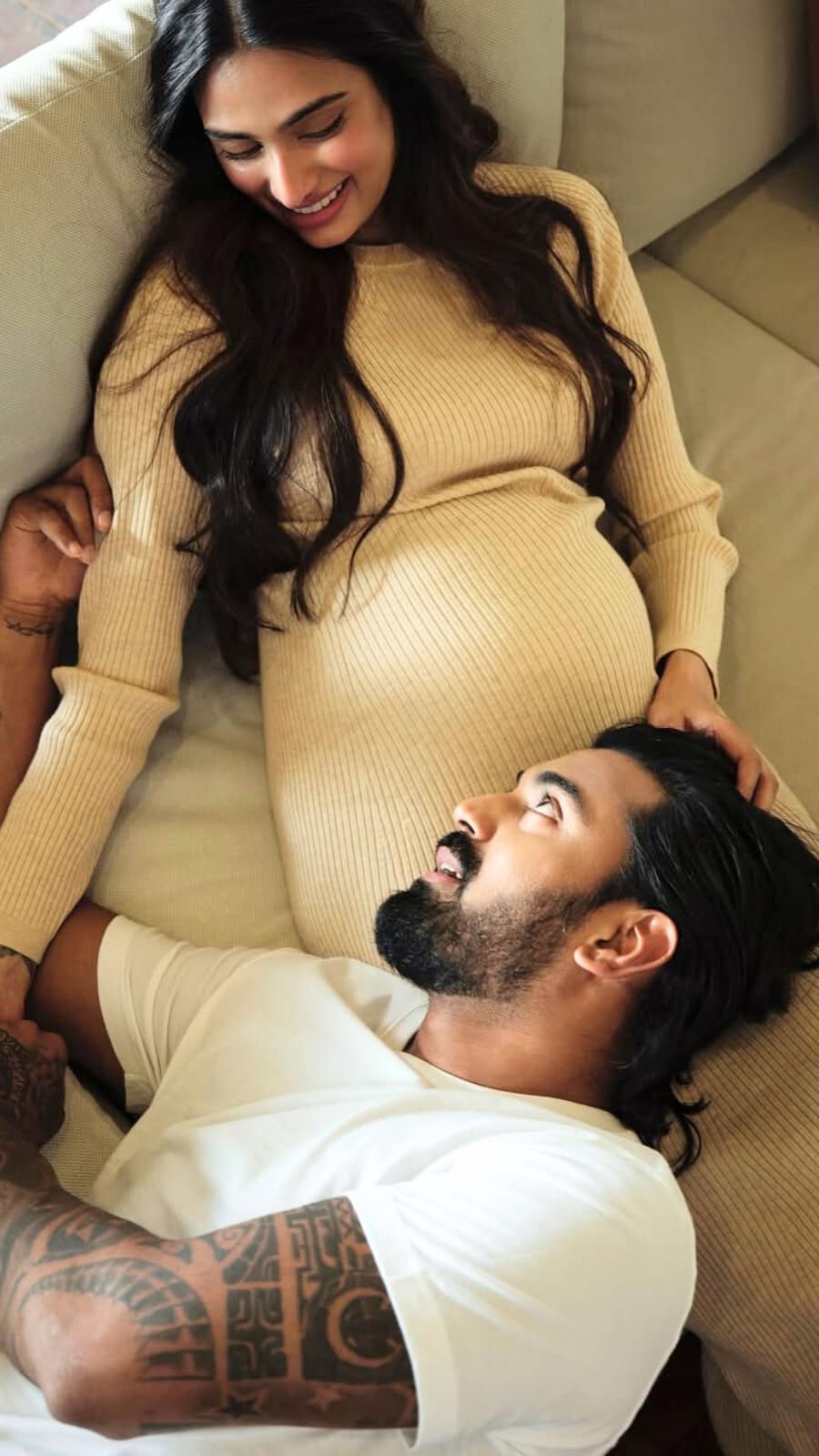 Athiya’s maternity shoot featured cosy knitwear, including a stylish brown sweater and skirt, complemented by gold accessories