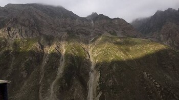 The meadows of Sangam (3514 m) are at the southern base of a couple of black-grey rock and schist peaks called Kajpathar (4820 m and 4905 m). This is a dramatic rock ridge decorated with slices of ice. They are drained to the west by the Kajpathar nar that, just south of Zoji la, emerges out of a dark gully as a short and steep waterfall. This can be seen from the road to Zoji la from Baltal, and one is struck by its inaccessibility. Yet, E.F. Neve and Kenneth Mason made a route along this waterfall and thence up Kajpathar nar stream through long snow and ice fields and reached Kajpathar. They then came down the steep rock face of Kajpathar peaks and met the path to Amarnath from Sangam.