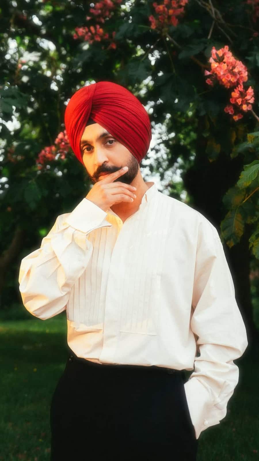 His black leather jacket adds to the biker-chic aesthetic, styled perfectly with a light-coloured turban