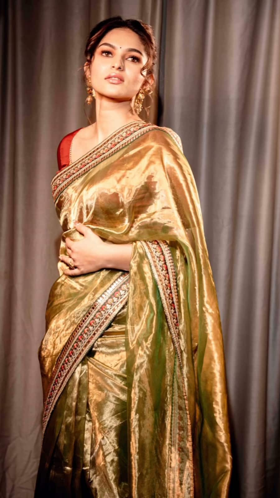 The actress channels retro charm in a plain navy-blue saree with a sleek gold border