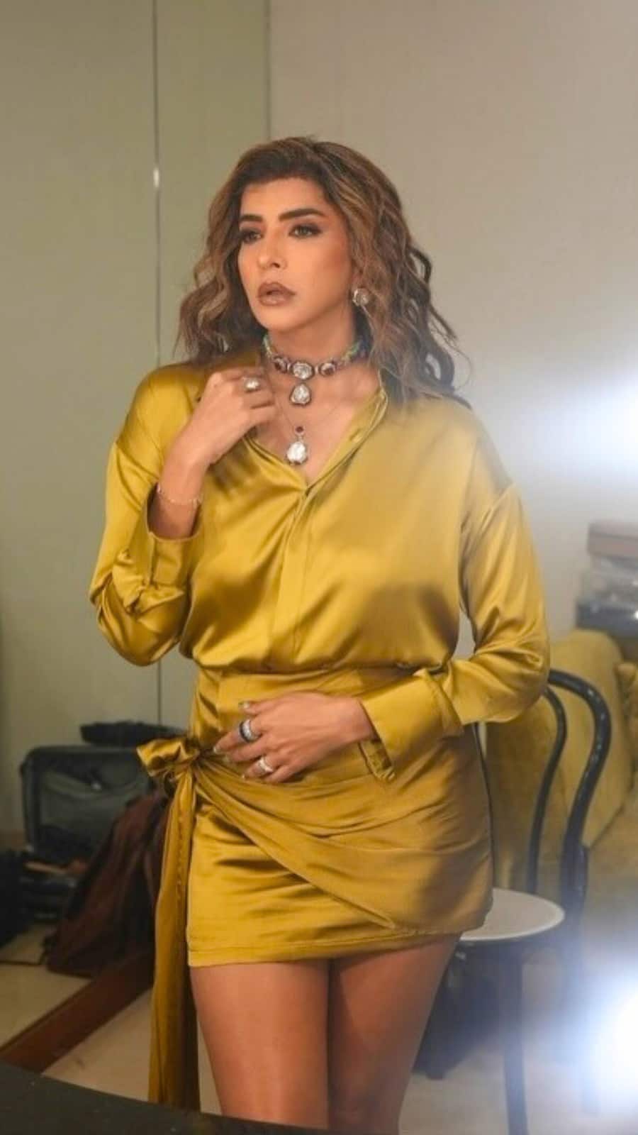 This vibrant, detailed outfit perfectly matches Lakshmi’s vibe and unflinching spirit.
