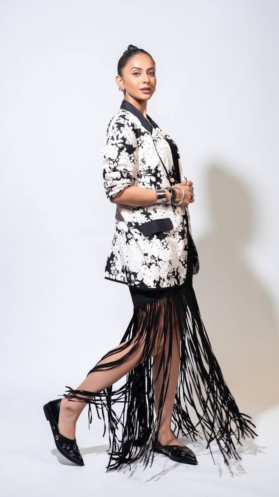 The actress nails the trend in a black moss crepe dress with fringes, styled with a printed silk blazer