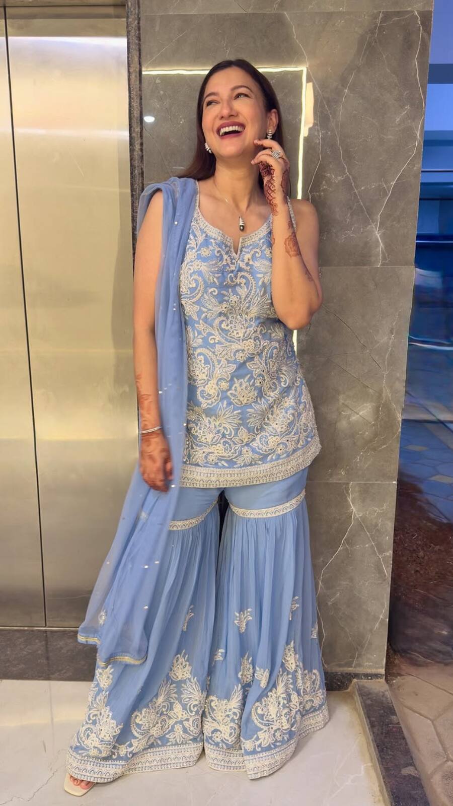 Gauahar exudes elegance in a golden double-layered suit set paired with traditional juttis