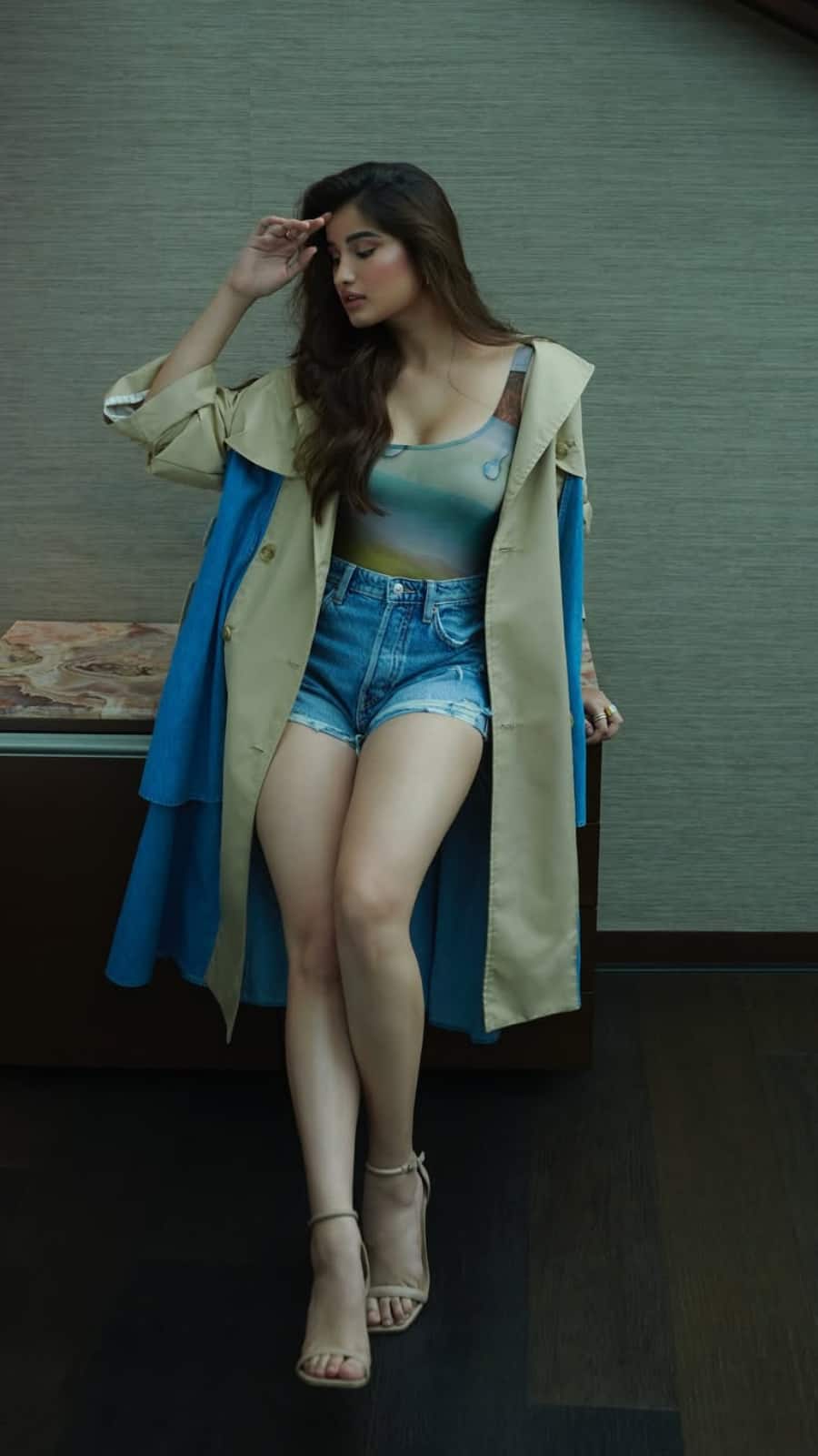 She looks stylish in a multi-coloured top tucked into denim shorts, layered with a trench coat—perfect for the season